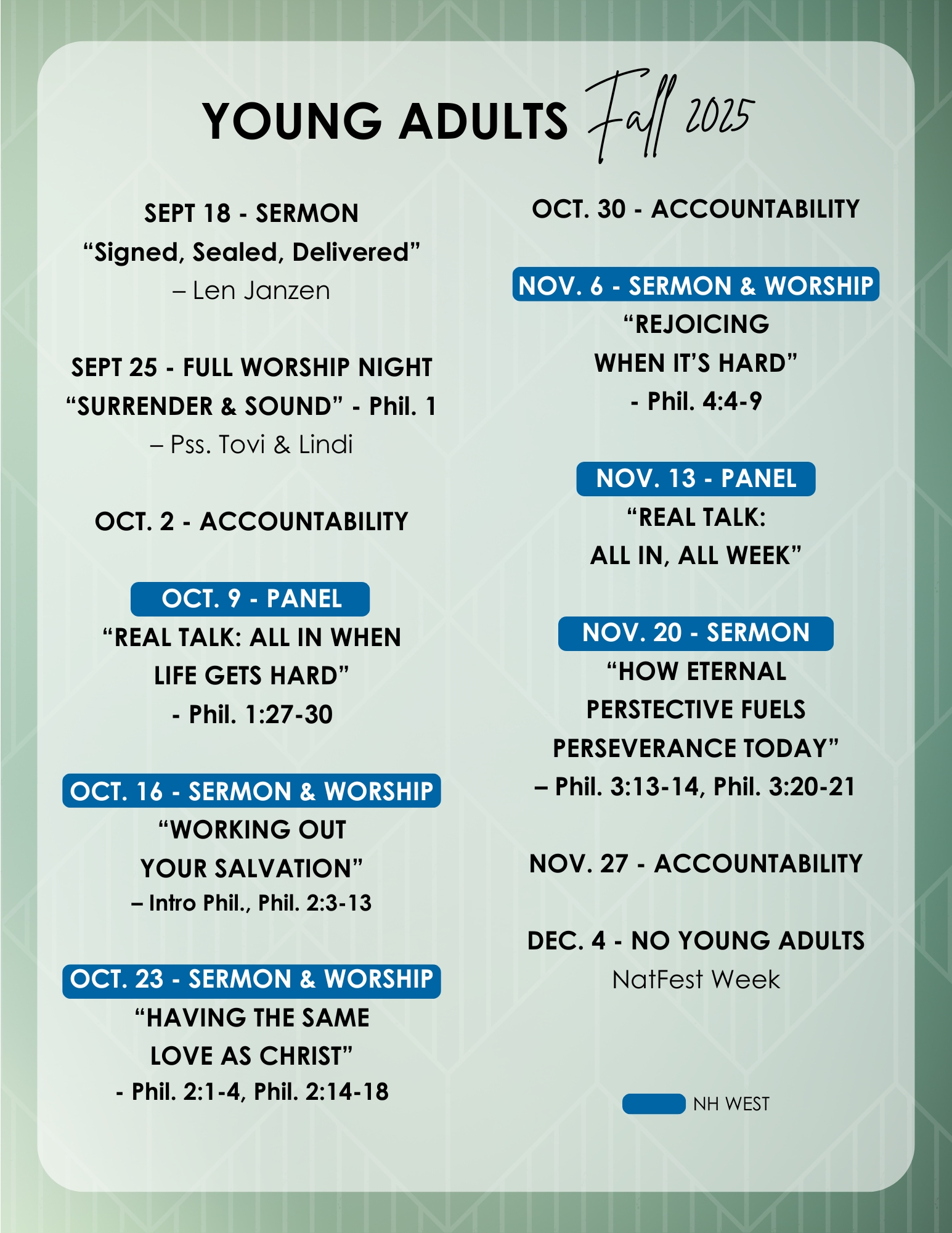 Every Thursday from 7:00pm-9:00pm we provide weekly Bible studies and corresponding messages, worship, occasional hot topic nights relevant to your life stage, and regular social events to foster intimate community. If you’re 17-30ish and looking to further your faith, relationships, and community, NHCN Young Adults is for you!
